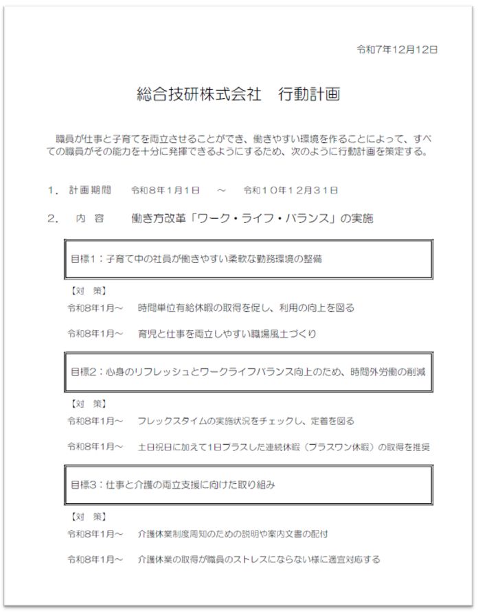 従業員の仕事と子育ての両立を支援するための雇用環境の整備やすべての従業員の多様な労働条件の整備に取り組むため「一般事業主行動計画」を策定しました。